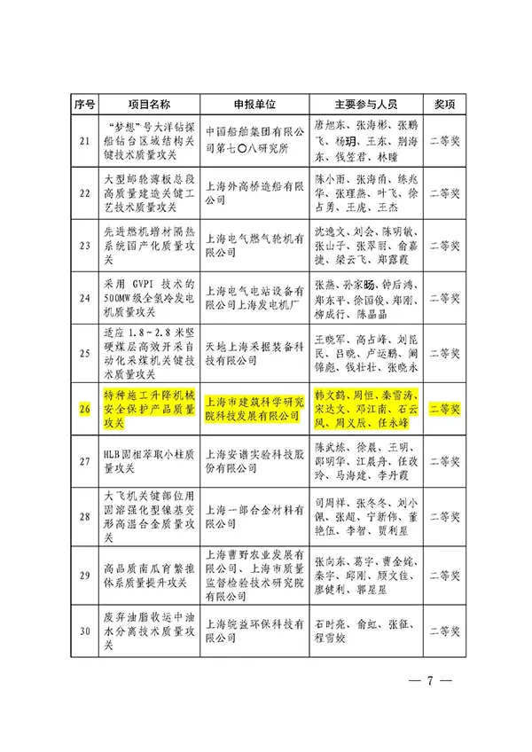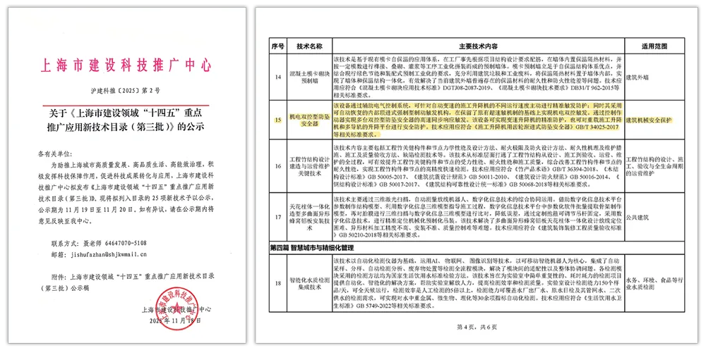 《特種施工升降機(jī)械安全保護(hù)產(chǎn)品質(zhì)量攻關(guān)》項(xiàng)目榮獲2025年度上海市重點(diǎn)產(chǎn)品質(zhì)量攻關(guān)成果二等獎(jiǎng)。該項(xiàng)目成功研制高速重載、超低速、自復(fù)位漸進(jìn)式等6大系列防墜安全器,為我國(guó)施工升降機(jī)械安全保護(hù)和行業(yè)質(zhì)量升級(jí)提供了堅(jiān)實(shí)支撐。