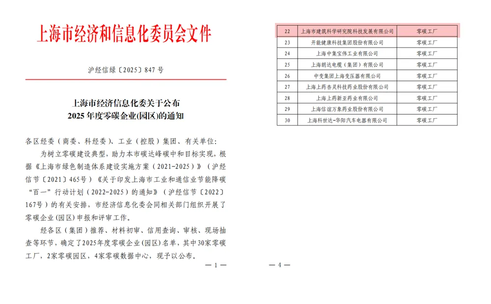 近日,上海市經濟信息化委發布了關于公布2025年度零碳企業(園區)的通知,公布了2025年度零碳企業(園區)名單,上海市建筑科學研究院有限公司(以下簡稱“建科院”)下屬上海市建筑科學研究院科技發展有限公司(以下簡稱“科技公司”)榮獲上海市“零碳工廠”稱號。