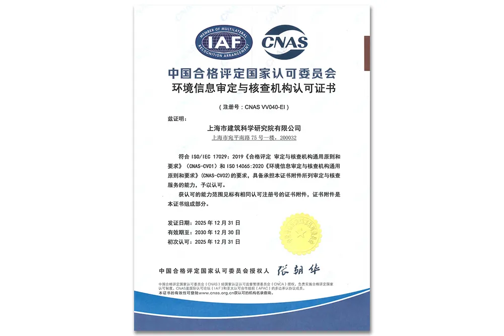 近日,上海市建筑科學研究院有限公司(以下簡稱“建科院”)正式獲得中國合格評定國家認可委員會(CNAS)溫室氣體審定與核查機構認可證書(注冊號:CNAS VV040-EI)。這一認可標志著建科院在溫室氣體核查領域的服務能力已達國家級標準,未來將為各類企業與機構提供更權威、專業的碳核查技術支持。